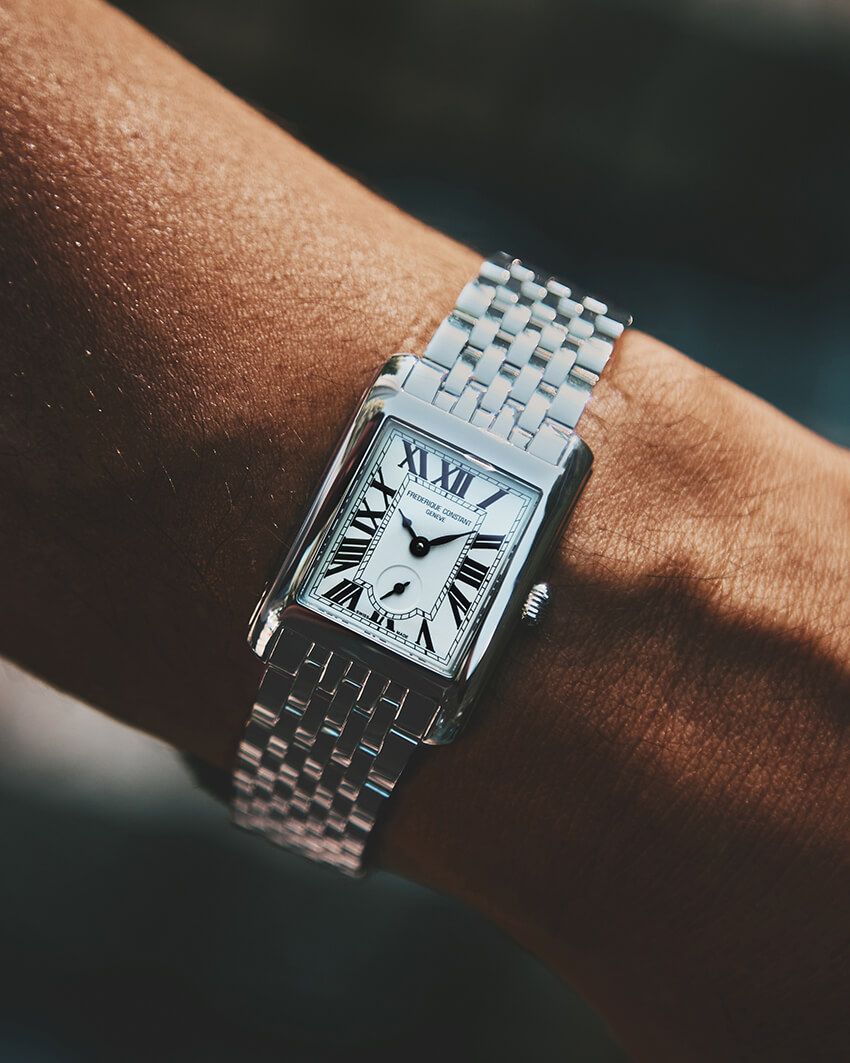簡潔さが際立つ白ダイヤル。「クラシック カレ スモールセコンド」(FC-235S2C6B)、ケースサイズ縦27.6×横25.2mm、クォーツ。19万8000円/フレデリック・コンスタント 0570-03-1988