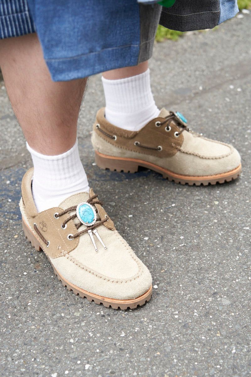 ▶︎アカオさんのスナップをすべて見るアカオさん(31歳)黒Tとパッチワークショーツ、どちらもオーバーサイズをセレクト。チャーム付きのキーチェーンやバンダナなど、随所に遊びが利いた小物使いも披露した。そしてティンバーランド×パッカーの「スリーアイ」でカジュアルな装いを締めくくる。白ソックスで抜け感を出したところにも注目を。