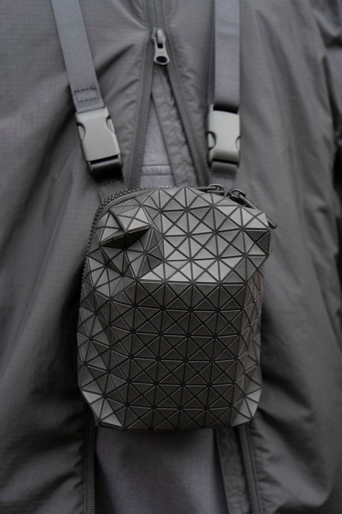 その中軸を、バオバオイッセイミヤケの個性派ポーチが担う。三角形のパーツを繋ぎ合わせた無二の幾何学的デザインが、グレーで揃えたトップスをバックに堂々浮かび上がる。