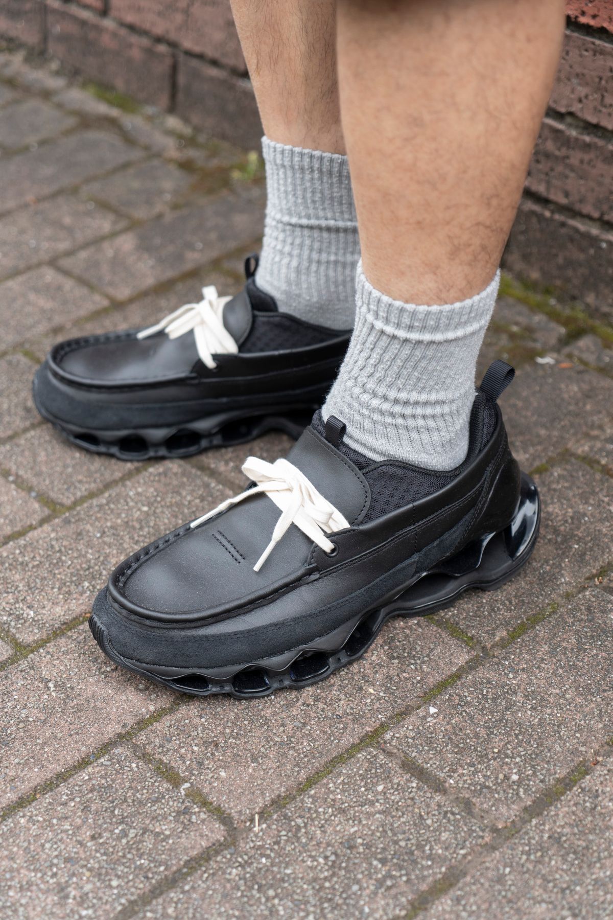 ▶︎月原さんのスナップをすべて見る月原敏文さん(39歳)白、黒、グレーをバランスよく織り混ぜ、素材感の差で立体的なビジュアルを手に入れる。モノトーンのお手本ともいうべき、気配りの効いたコーディネイトだ。