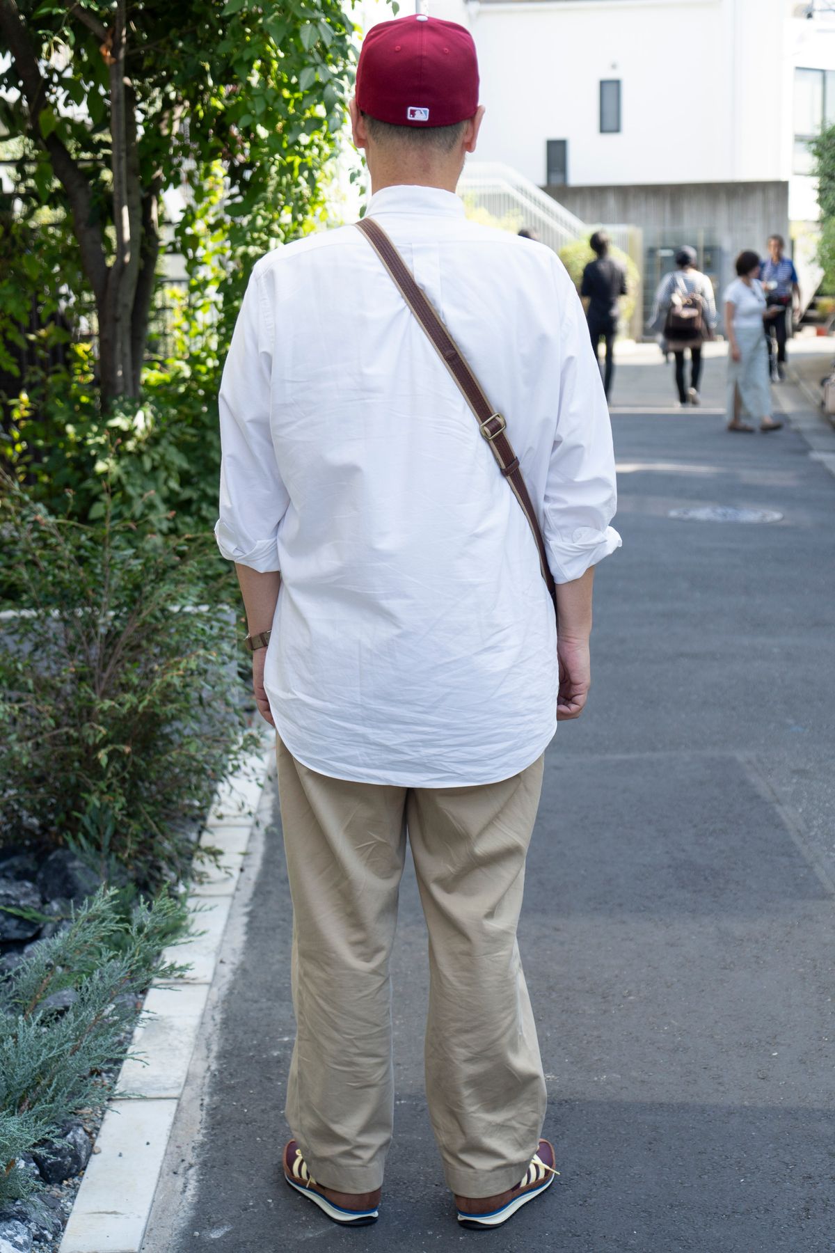 ▶︎小堀さんのスナップをすべて見る小堀一章さん(53歳)モダンなビッグシルエットで楽しむ、B.D.シャツとチノーズのクラシカルな合わせ。リラックス感を伴侶に据え、名家の名作は今の気分にもしっかりアジャストする。