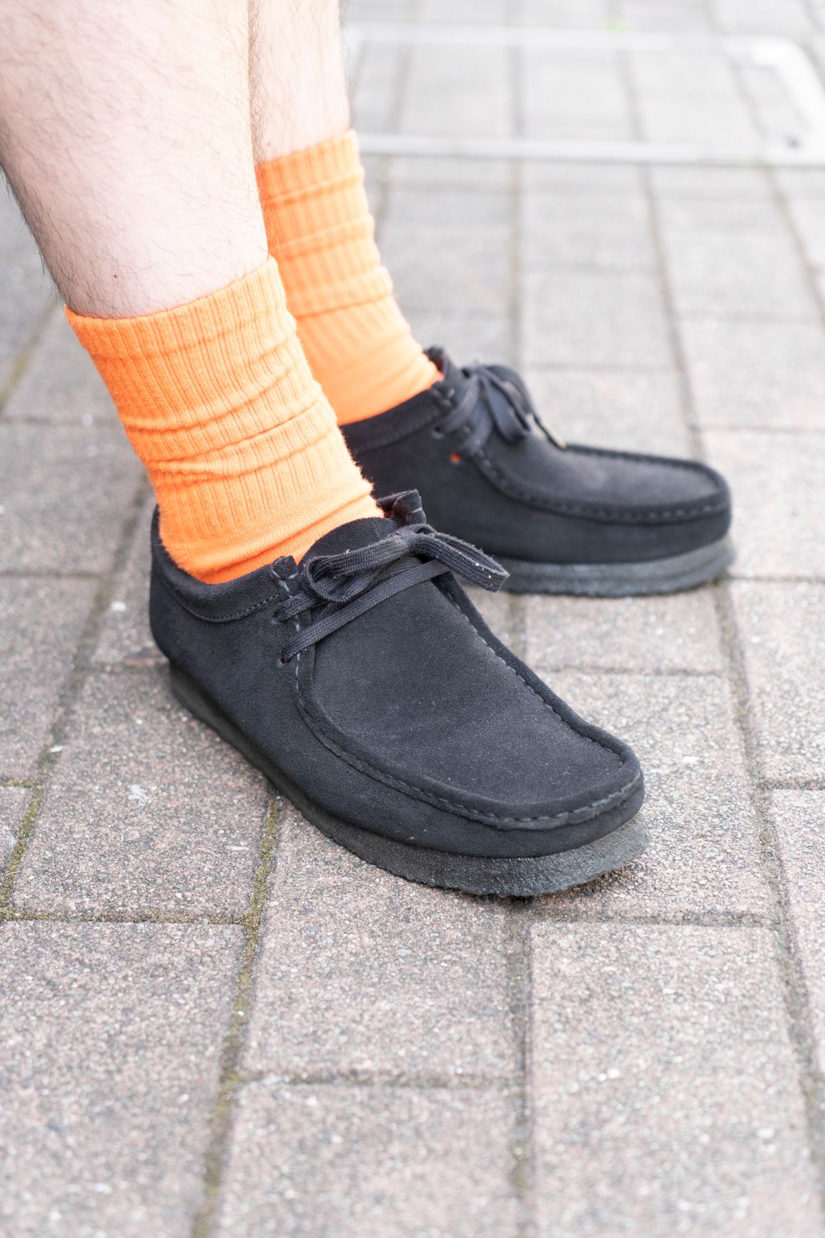 足元にビビッドなオレンジを挿し、「ワラビー」と合わせる。これもブラックだからこそ映えるテクニックだ。ブラウンのチェックシャツ&オフホワイトのショーツとの色合いもいい感じ。