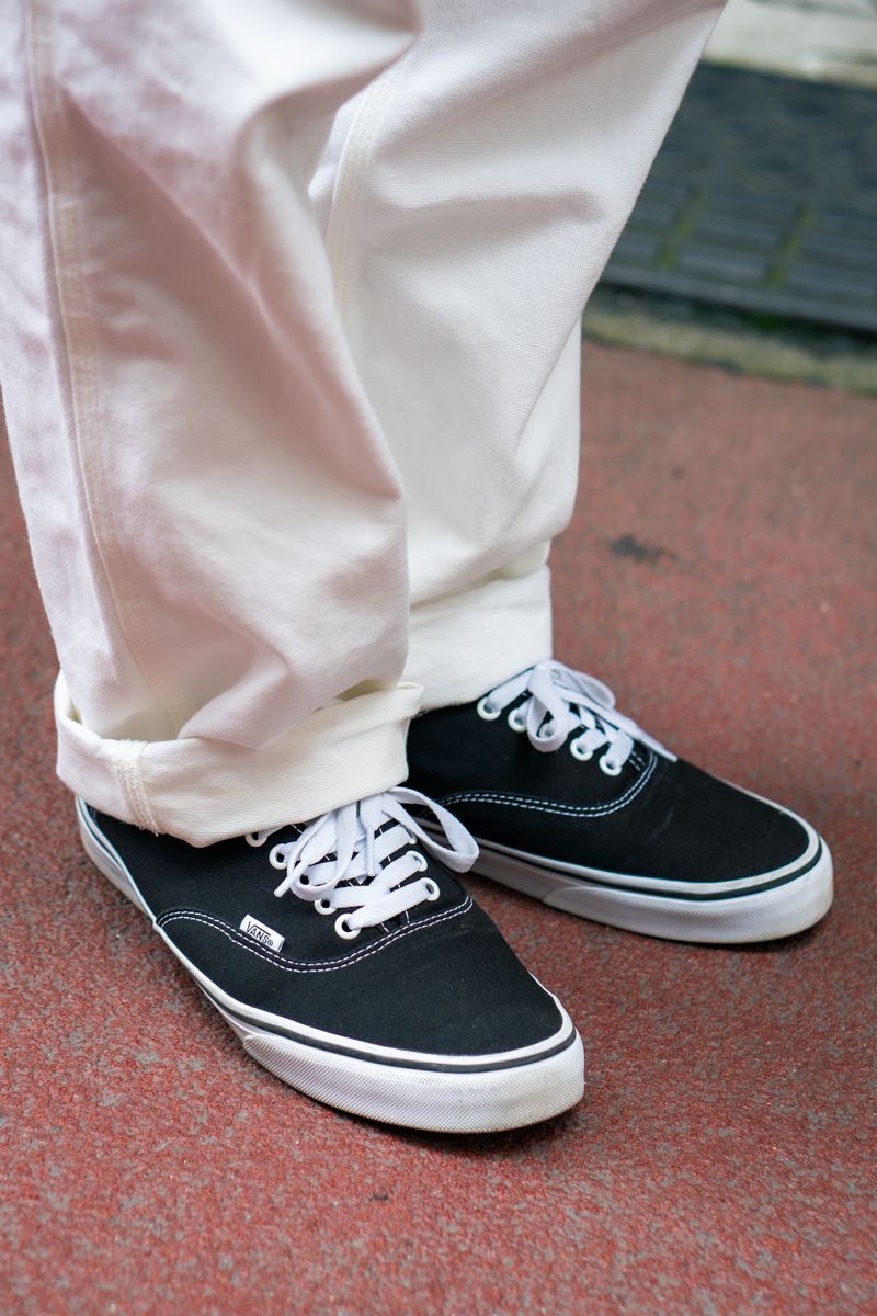そんな装いを足元から支えるのが、ヴァンズの名作「オーセンティック」。小野寺さんだけでなく、街を見渡せばその人気の高さは一目瞭然。まさにブランドを象徴する一足だ。