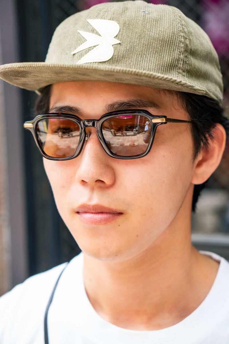 Tシャツ=ヘインズ パンツ、帽子=ともにパタゴニア シューズ=キーン 眼鏡=金子眼鏡 バッグ=イルビゾンテ 腕時計=タグホイヤー