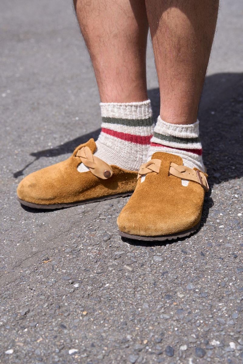 注目すべきは、ソックスと「ボストン」の合わせ技。ブラウンのスエードにライン入りソックスを合わせることで、こなれた雰囲気を演出。さらに「ボストン」とシャツのトーンを合わせることで、統一感を生んでいるのだ。