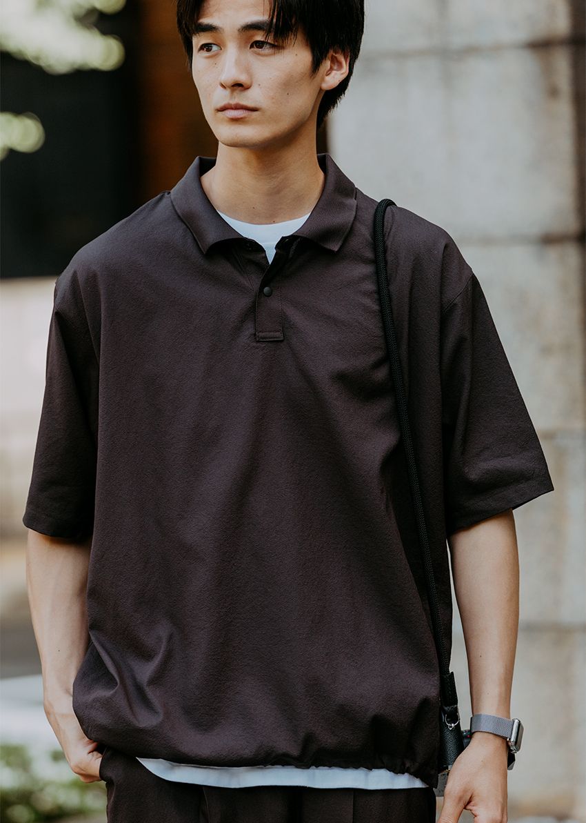 Tシャツ同様にボックスシルエット&ドローコードを採用。ポロシャツ特有の襟元のボタンの開け閉めで、さらに表情に変化を加えることができる。