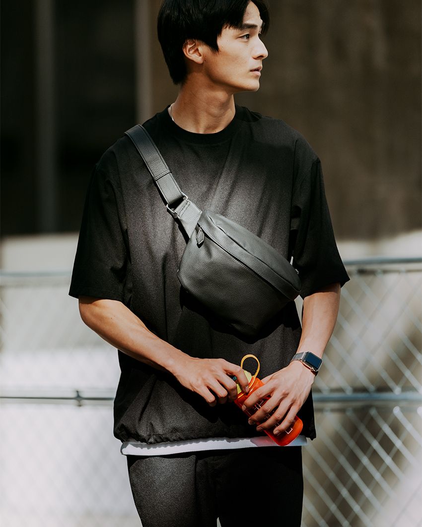 上下ブラックをチョイスすれば、都会的なムードに。レザーポーチやスニーカーなど、合わせるアイテムを黒でまとめれば、グッと引き締まるはず。Tシャツ6930円、中に着たTシャツ2420円、パンツ8910円、バッグ1万2100円/すべてグリーンレーベル リラクシング、シューズ1万4960円/ニューバランス for グリーンレーベル リラクシング