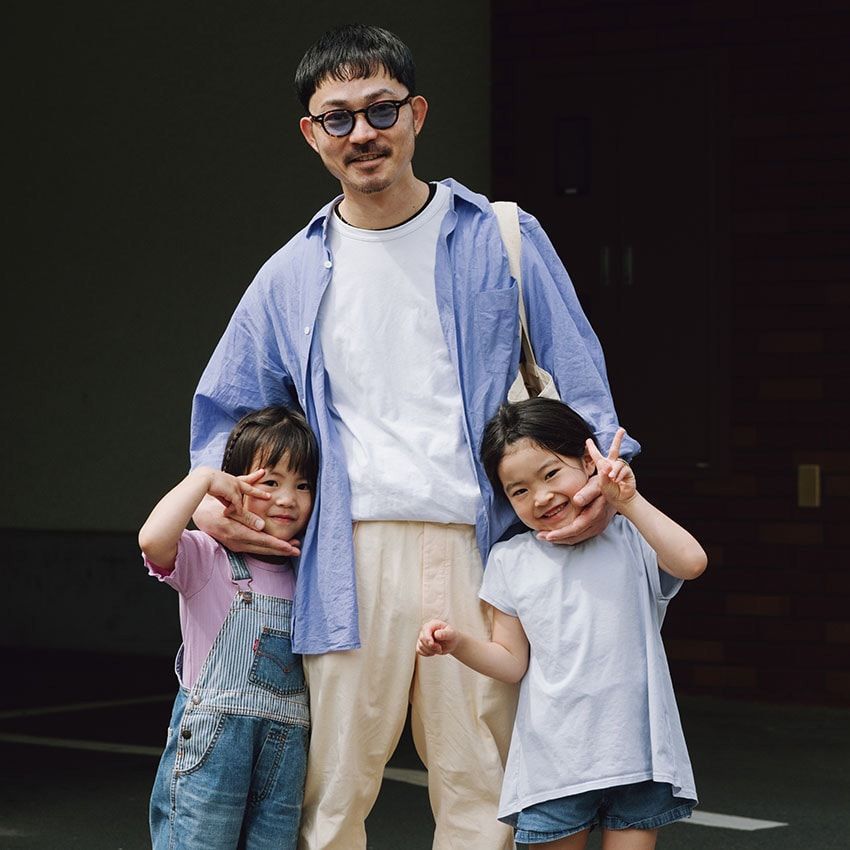 成 雄大さん / 39歳人気の青シャツを楽しむ。オーバーサイズをチョイスして、前を開けて。合わせるパンツもしっかりと太め。