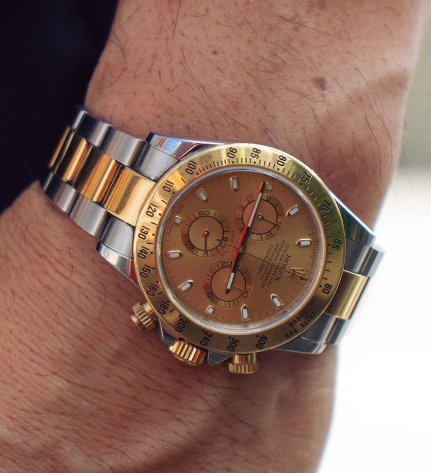 腕時計=ロレックス Tシャツ=ロサンゼルス アパレル パンツ=シュプリーム サンダル=アイランドスリッパ サングラス=アイヴァン