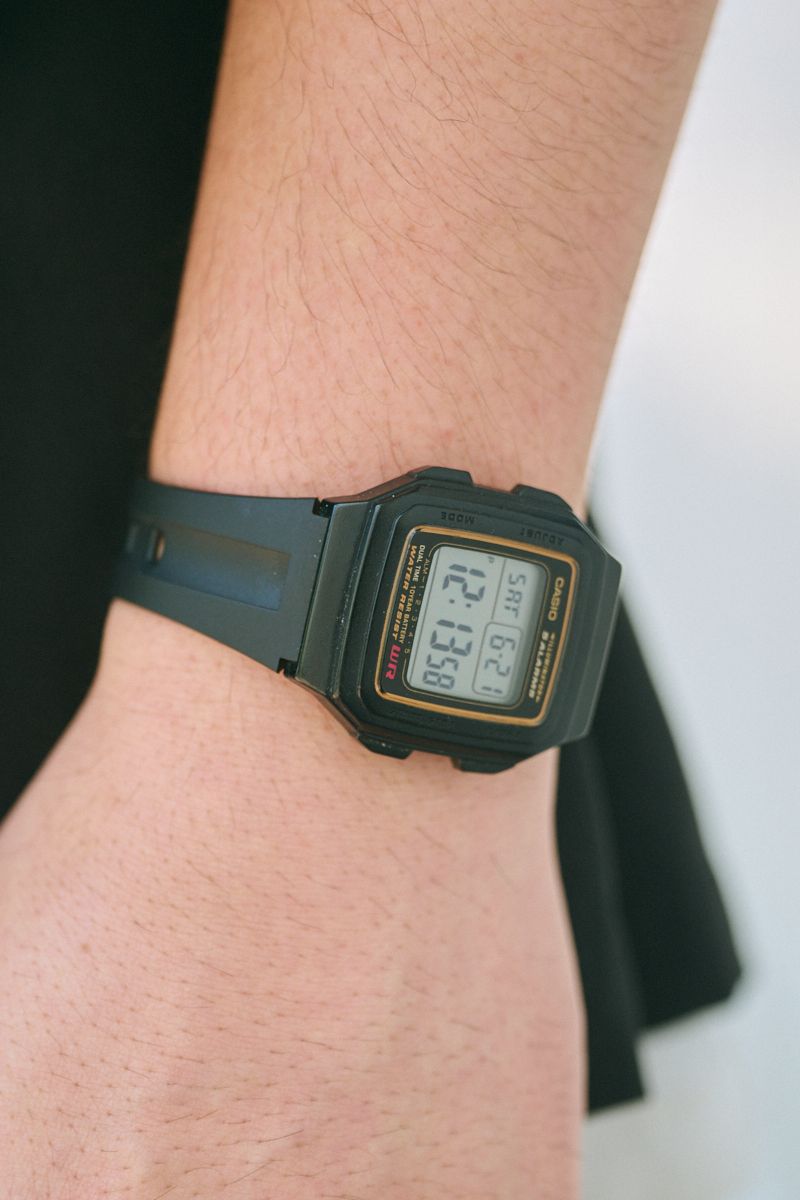 シャツ、眼鏡=ともにユニクロ パンツ、帽子=ともに古着 シューズ=ナイキ×シュプリーム 腕時計=カシオ