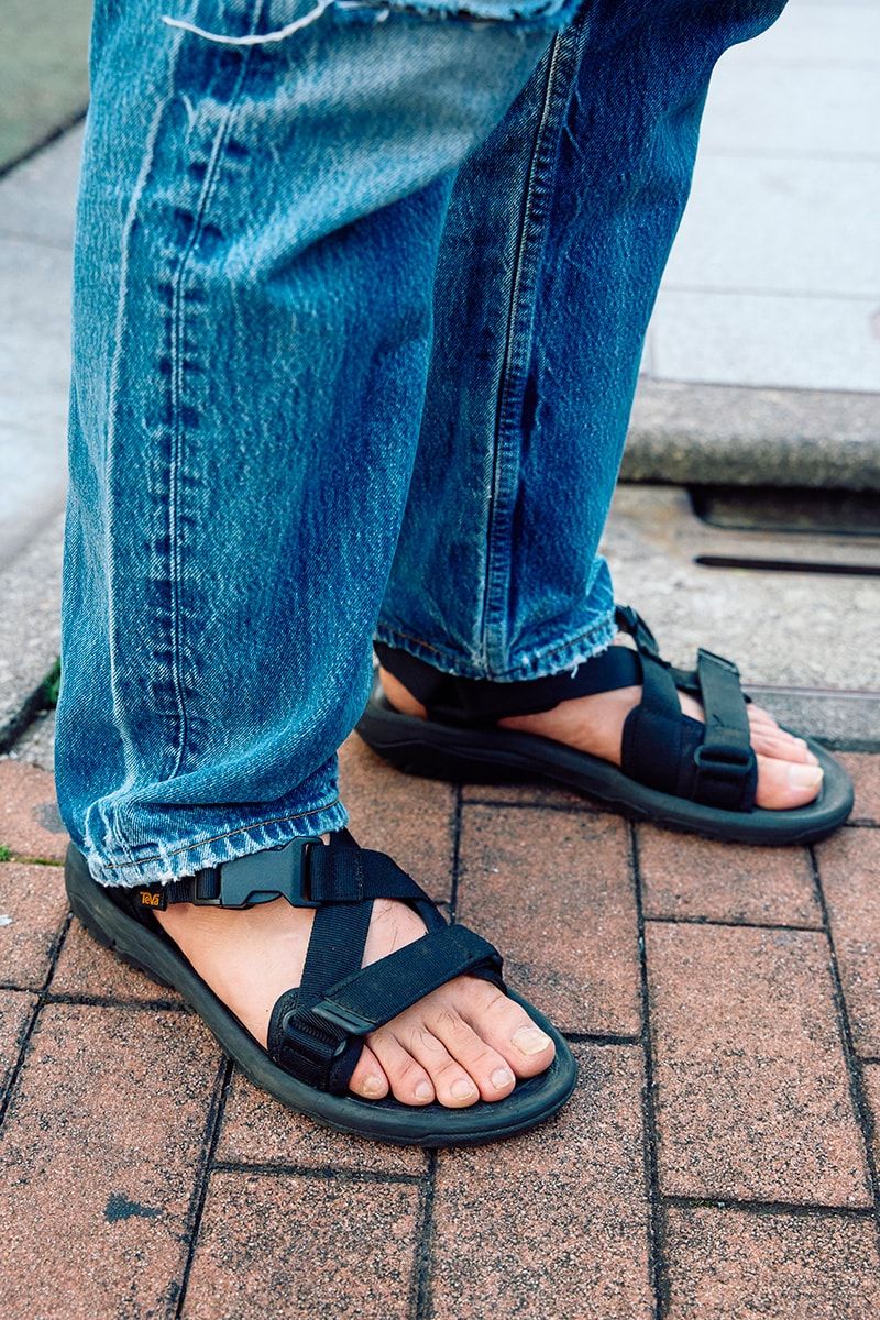 ▶︎新山さんのスナップをすべて見る新山 力さん(36歳)インディゴのフェードが調子良く、ナチュラルなダメージも気持ち良し。Tシャツとサンダルで挟むだけというミニマルな出立ちに、リーバイスの普遍的凄みが際立つ。