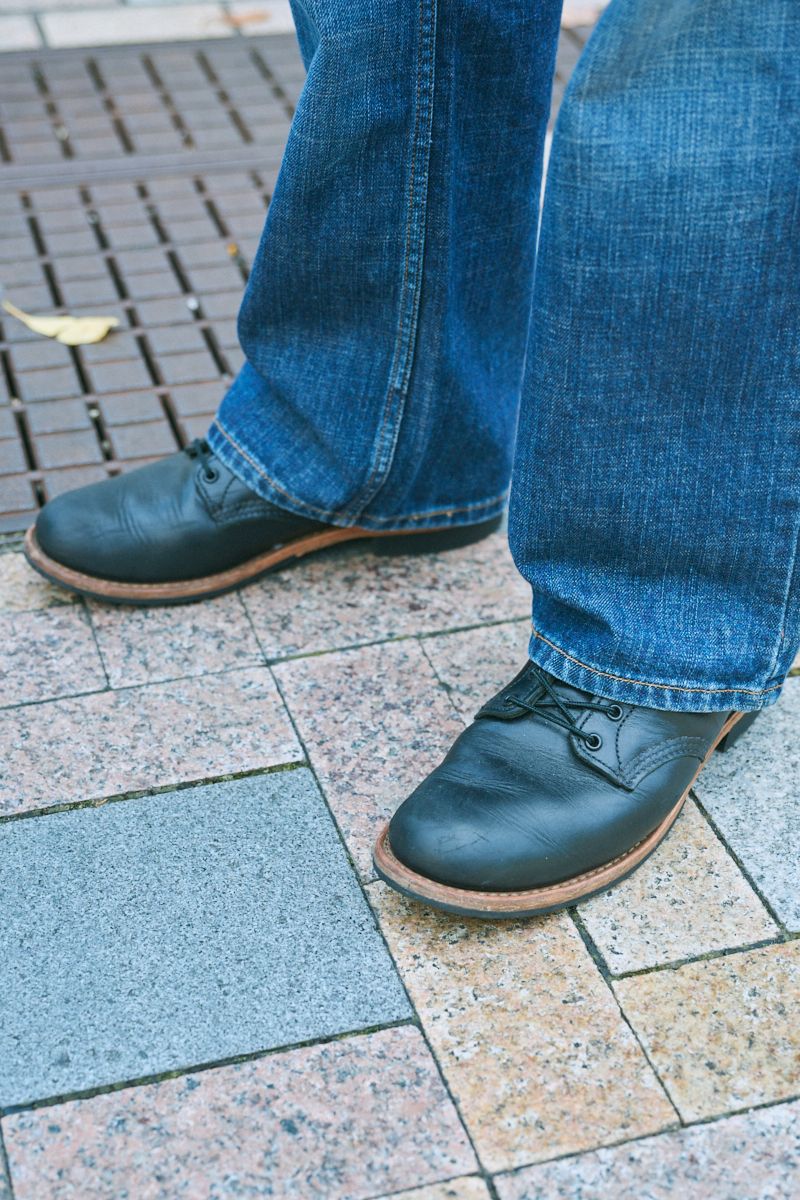 シャツ=ダブルアールエル デニム=リーバイス シューズ=レッドウィング 眼鏡=レイバン アクセサリー=ヴィンテージ