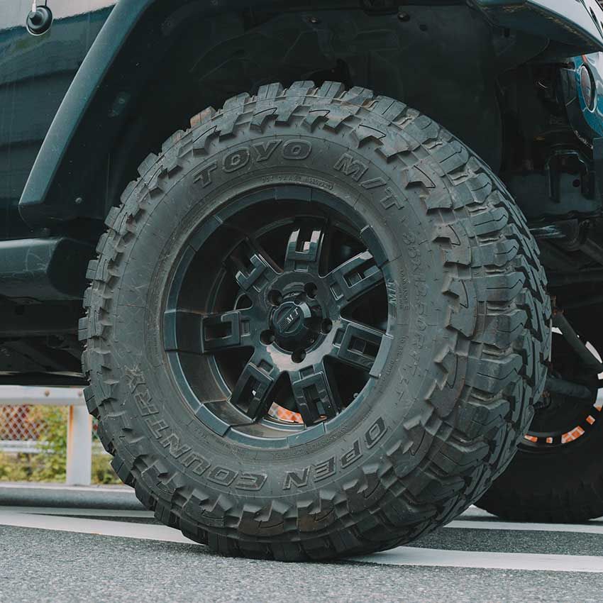 こちらは土山さんが14年乗ったジープのタイヤ。確かに、遺伝子は引き継がれている。