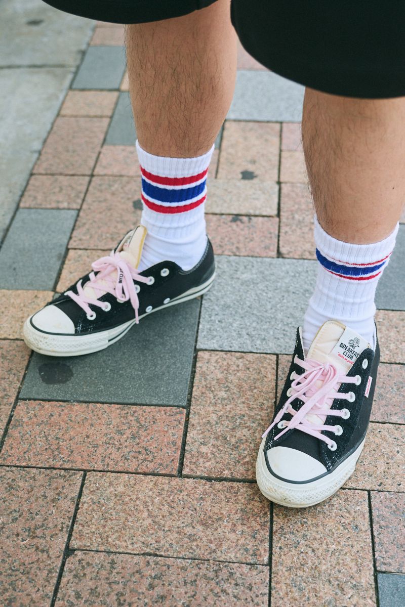 あえて少々褪色させたピンクのシューレースが、ブルー&ブラックが基調のクールなコーディネイトを暖かく飾る。ラインソックスとの若々しい合わせも、いいね!