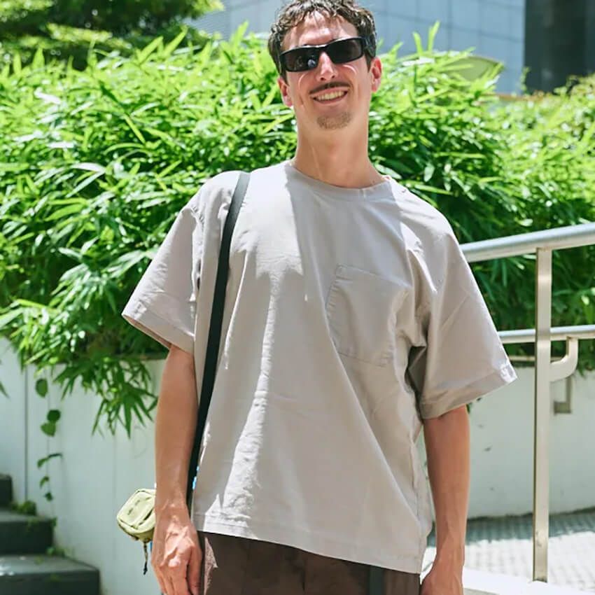 ▶︎宮本さんのスナップをすべて見る宮本大聖さん(27歳)菊池式のベースは軽やかな夏服。Tシャツと短パンが軸になる。そこに、どう大人っぽさを追加するかがキモ。その大役を、シンプルな無地のソックスに一任するのである。