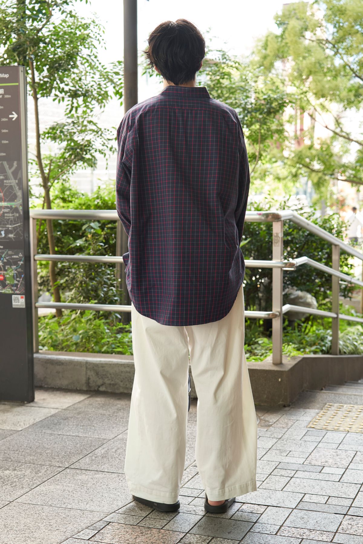 コーディネイトも自然体で。チェックシャツをさらりと羽織って、足元はサンダルで楽ちんに。これだけでOK。むしろ、これだけがゆえにパンツがより映える。