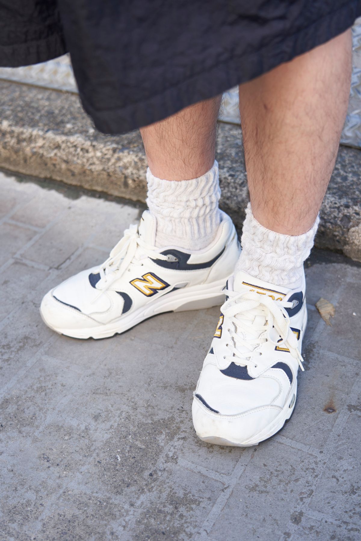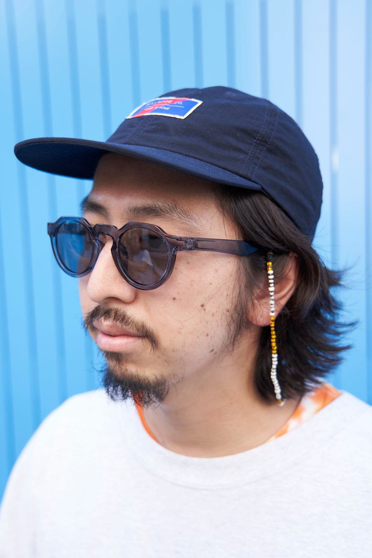 Tシャツ=キャンバー カットソー=古着 パンツ=テアトラ シューズ=ニューバランス 帽子=ベストメイド 眼鏡=ジュガードフォーティーン 腕時計=アップル