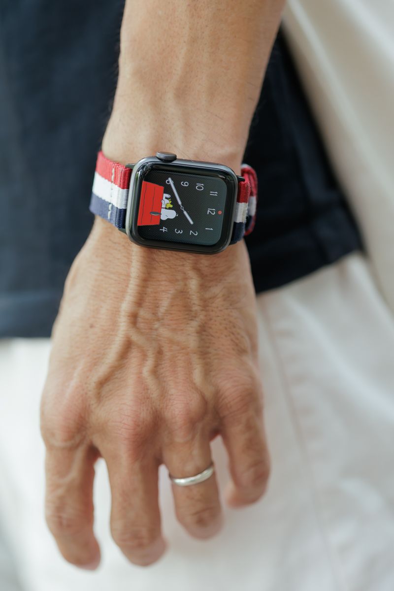 ▶︎山本さんのスナップをすべて見る山本史暁さん(51歳)楽しくてキャッチーなアップルウォッチを愛用していたのが山本さんだ。モノトーンでまとめた装いに合わせた、映える一本を早速チェック!