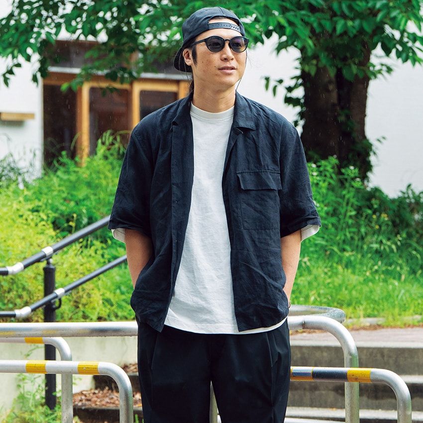 児玉太樹さん / 42歳開襟シャツ、白T、アンクル丈とサンダルのコンビネーション。全身の隅々に、オールブラックを重たく見せないギミックが満載。少々ルーズでルード、そんな雰囲気あるサイジングもグッド。
