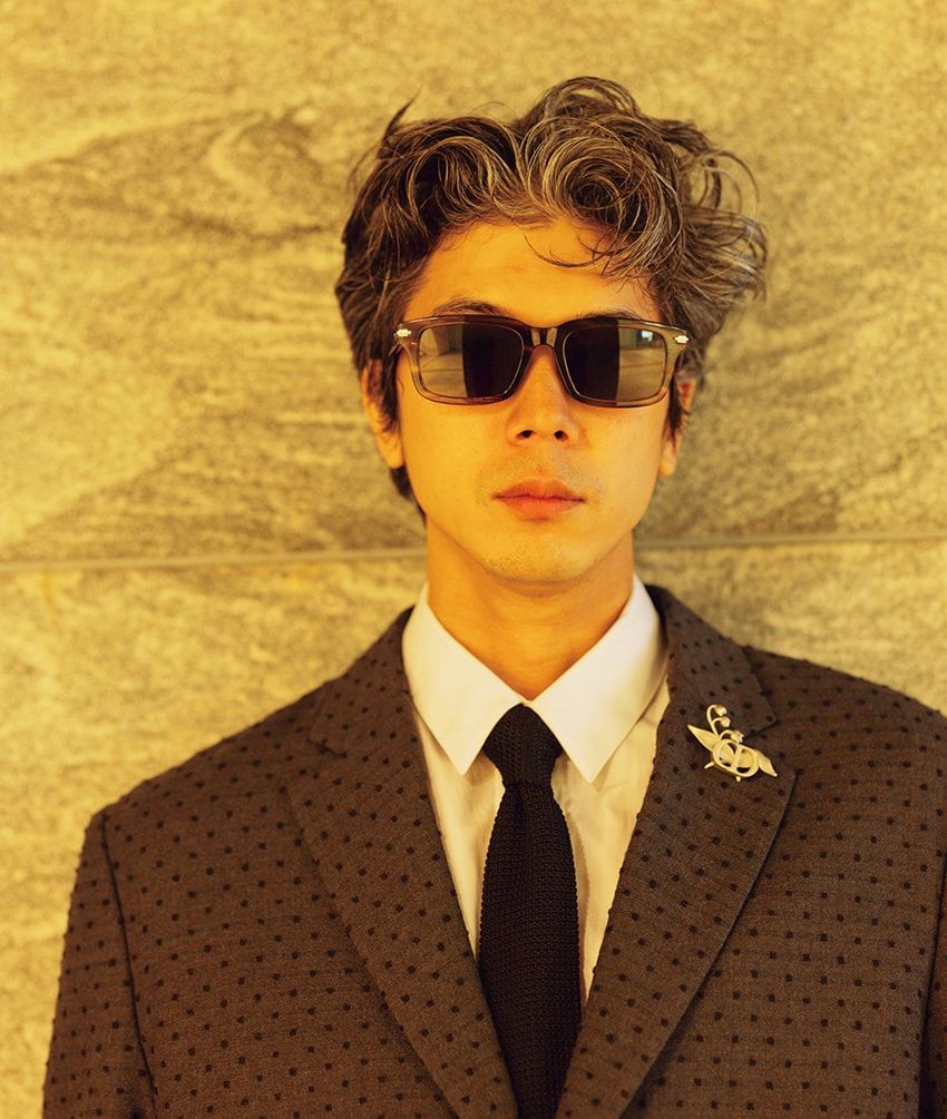 ジャケット49万円、シャツ14万5000円、パンツ25万円、スニーカー13万5000円、サングラス5万5000円[参考色]、ブローチ9万3000円、タイ3万7000円/すべてディオール(クリスチャン ディオール 0120-02-1947)