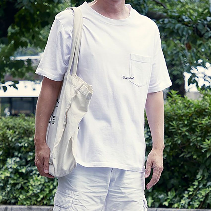 ▶︎鈴木さんのスナップをすべて見る鈴木敬士さん(36歳)胸元にワンポイントが入った白Tシャツに、ケンゾーの白パンツ。Tシャツはタックアウトで自然体なスタイルを作り上げている。シンプルなワンツーコーデではあるものの、細部には鈴木さん流のこだわりが。