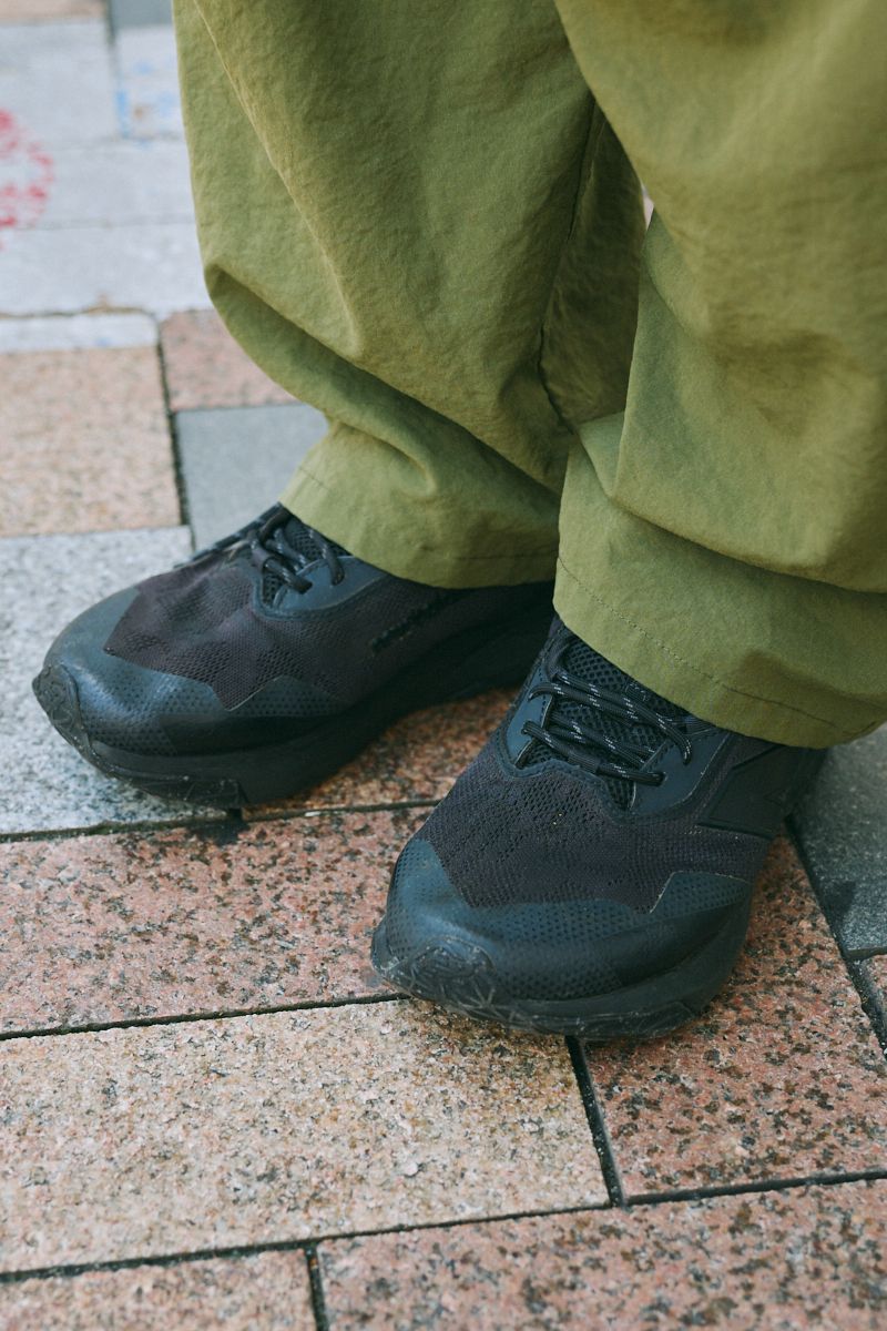 タックインさせたカーキのパンツも、サルエル風のイージー仕様という個性派。シンプルなワンツーコーデを、これほどまで自分色に仕立てるとは。見事なやり口!