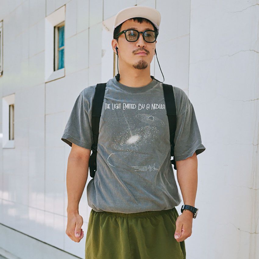 ▶︎谷垣さんのスナップをすべて見る谷垣隼人さん(37歳)フェードしたグレーカラーとスペーシーなイラストが、いい具合にイナタサを醸す。生地が薄くヨレた感じも、なんともいいアジ。これぞ古着の醍醐味である。