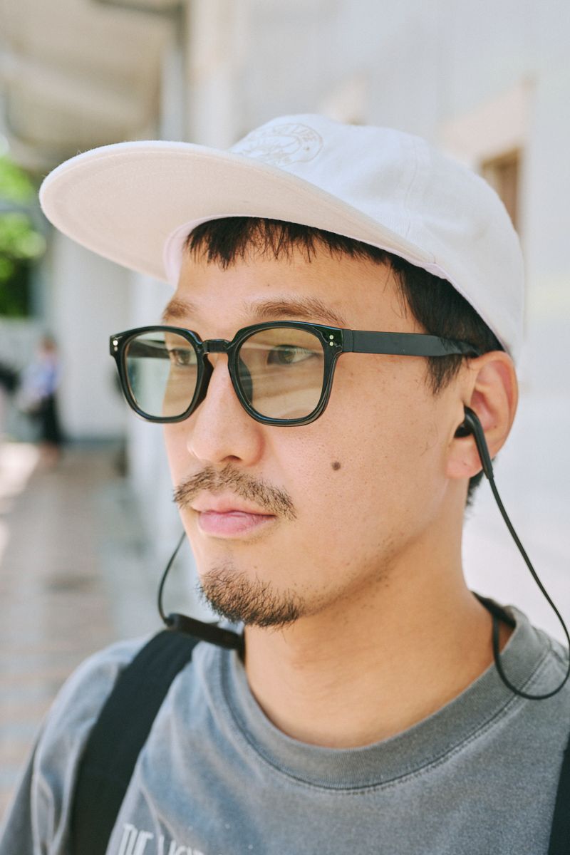 Tシャツ、帽子=ともに古着 パンツ=ヴォイリー シューズ=不明 眼鏡=ジンズ バッグ=クローム 腕時計=シチズン