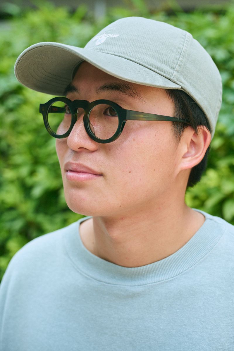 スウェット、パンツ=ともに古着 シューズ、バッグ=ともにエンダースキーマ 帽子=バブアー 眼鏡=ジャックデュラン リング=ティファニー