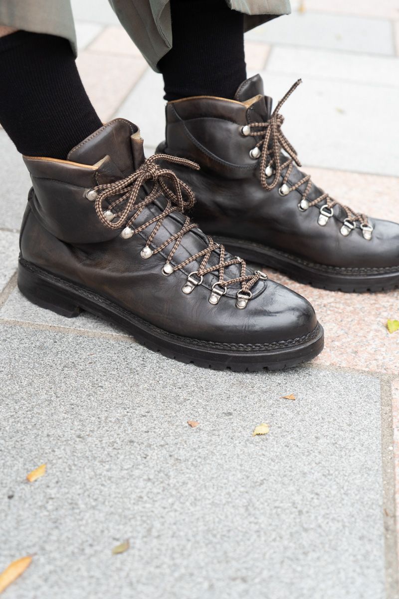 靴やアクセサリーはクラス感のあるイメージでまとめつつ、仕上げにグレーのスウェットシャツを無造作に肩掛け。グッドセンスを媒介に、緊張と緩和が混ざり合う。