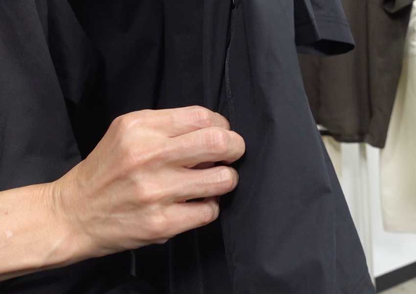 ハラ しかも吸水速乾だから、すぐ乾くもんね。パッカブルっていうから、胸ポケットに入ると思ったけど、サイドポケットに入れるんだ。つまり、着てるときにはサイドにも収納がある。これはいいな〜。