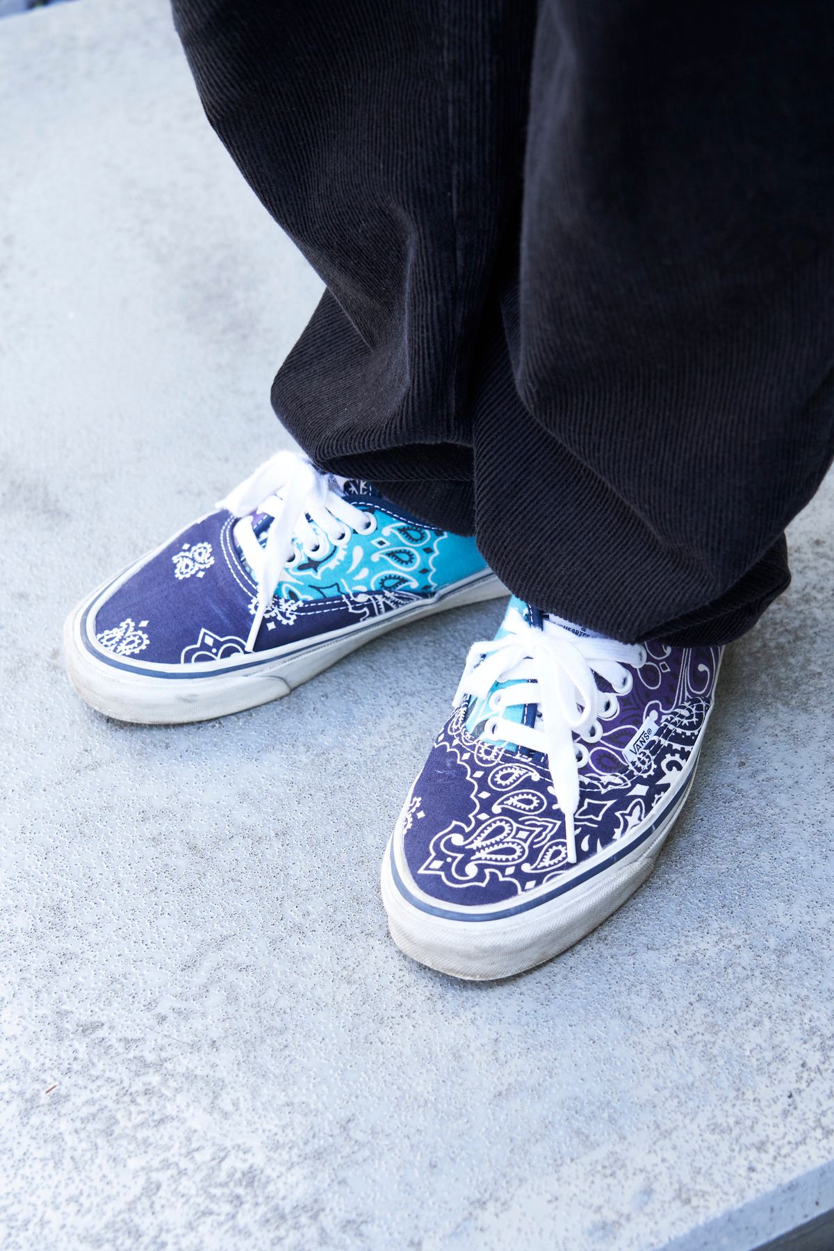 ▶K.Y.Oさんのスナップをすべて見るK.Y.Oさん(43歳)腰に巻いたシャツだけかと思いきや、足元のヴァンズまでペイズリー柄! Tシャツとパンツはともに黒で揃え、まるでサンドイッチのように色柄が続くバランスに。