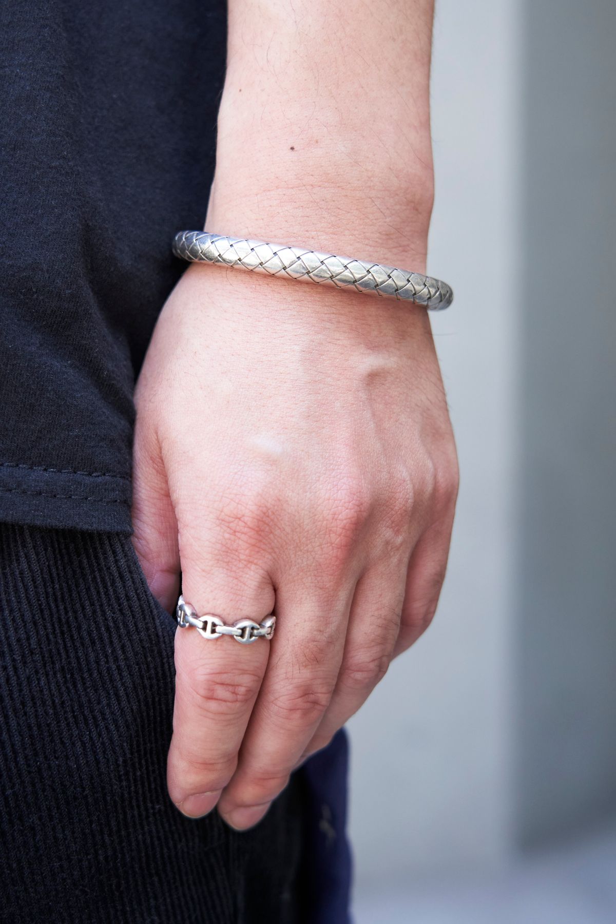 シャツ=ロンハーマン Tシャツ=クラブスタボーン パンツ=無印良品 シューズ=ヴァンズ ブレスレット=ボッテガヴェネタ リング=ホーセンブース