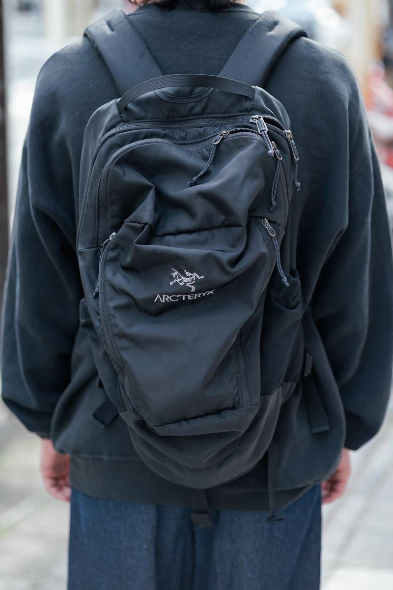 そんな名古屋さんが選んだのは、アークテリクスの黒バックパックだ。ブランドロゴをさりげなく配したミニマルなデザインは、都会的なスタイルにすんなりと馴染みむ。