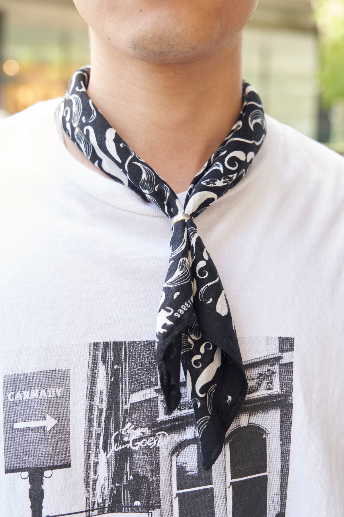 Tシャツ、スカーフ=ともに古着 パンツ=マーガレット・ハウエル シューズ=キーン 眼鏡=ゾフ バッグ=メゾン マルジェラ ブレスレット=コーチ リング=グッチ