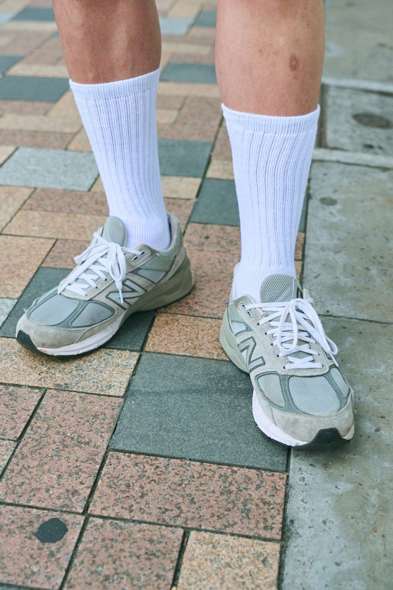 足元には定番のニューバランス「990v5」に、爽やかな白ソックスを合わせて軽快さを演出。スポーティながらも都会っぽいコーディネイトとなっている。