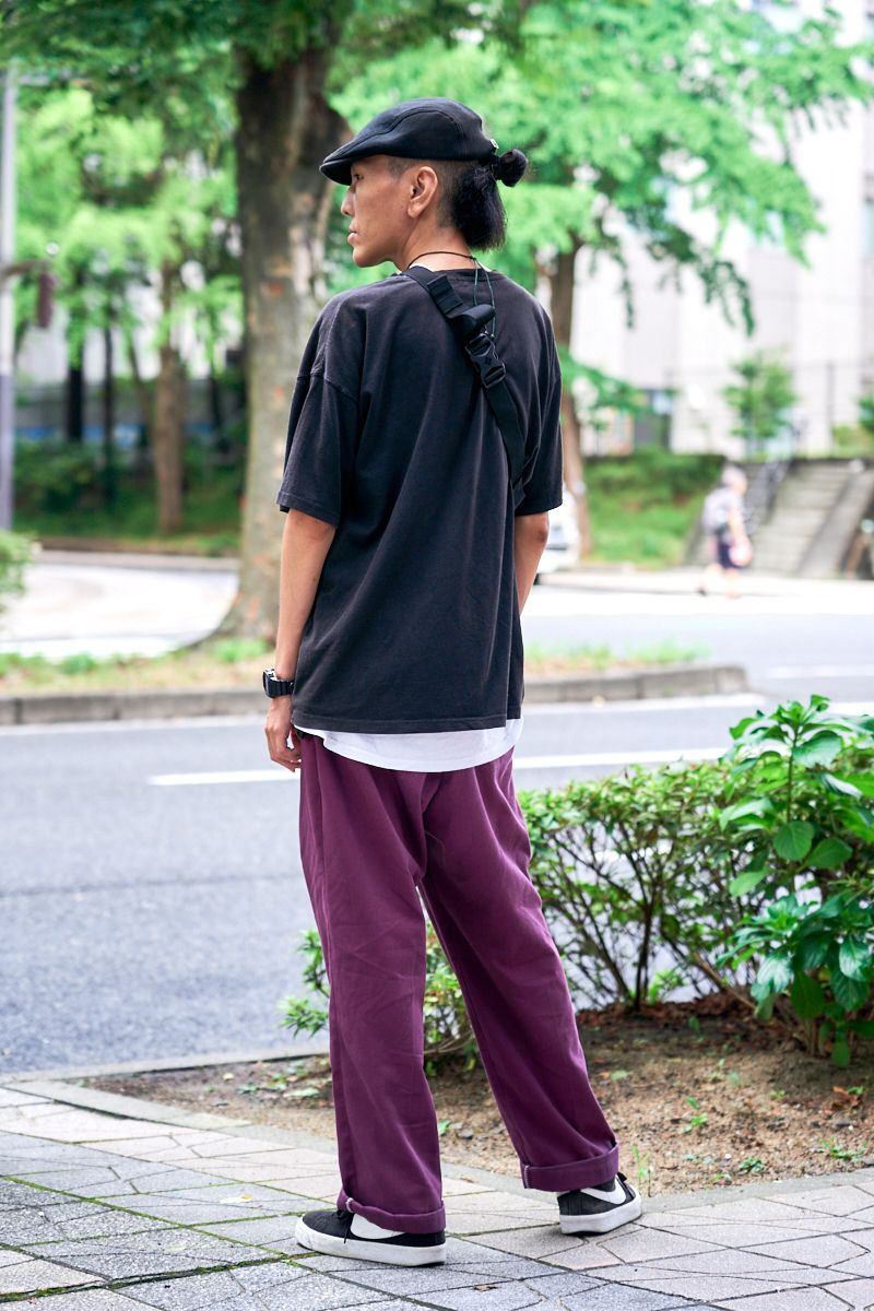 フリークス ストアの黒Tに、ディッキーズのワイドパンツ。深みのあるパープルのパンツがアクセントになり、単調になりがちな黒Tコーデに洒落感を添えた。インナーの白Tをチラ見せし、レイヤードを効かせたのも好印象。