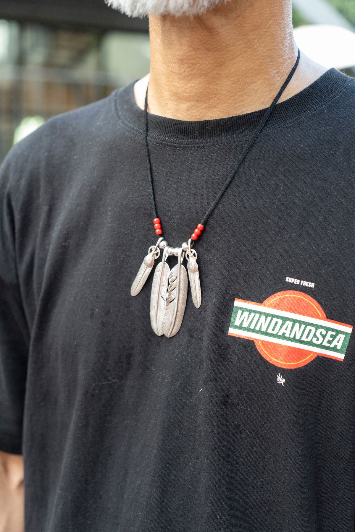 Tシャツ=ウィンダンシー パンツ=カーハート シューズ=ナイキ×シュプリーム 眼鏡=ジンズ ネックレス、リング=ともにゴローズ