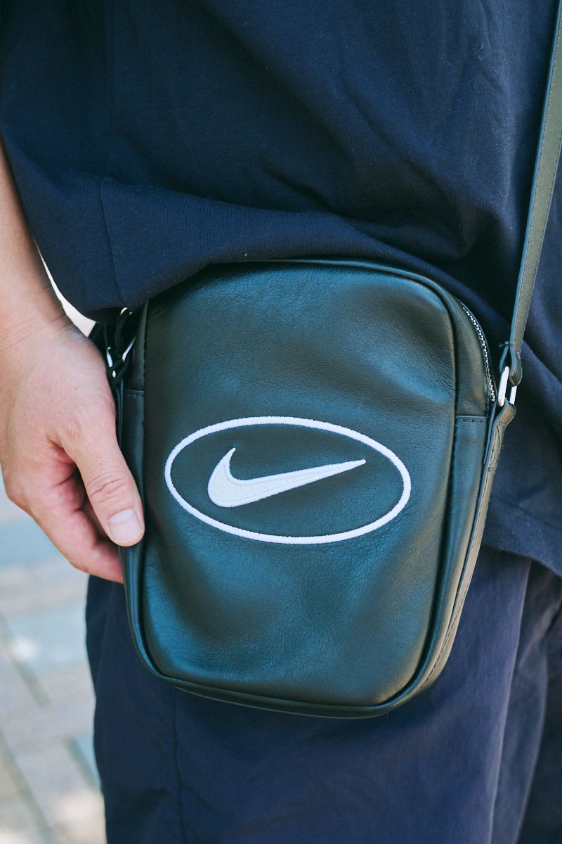 ▶︎ガッシュさんのスナップをすべて見るガッシュさん(45歳)ネイビーで揃えたセットアップ風のサマービジュアルを、カウハイドレザー製のコラボバッグが軽快かつ品良く飾る。片側にスウッシュ、もう片側にはシュプリームのロゴが刺繍された両A面の人気アイテムだ。