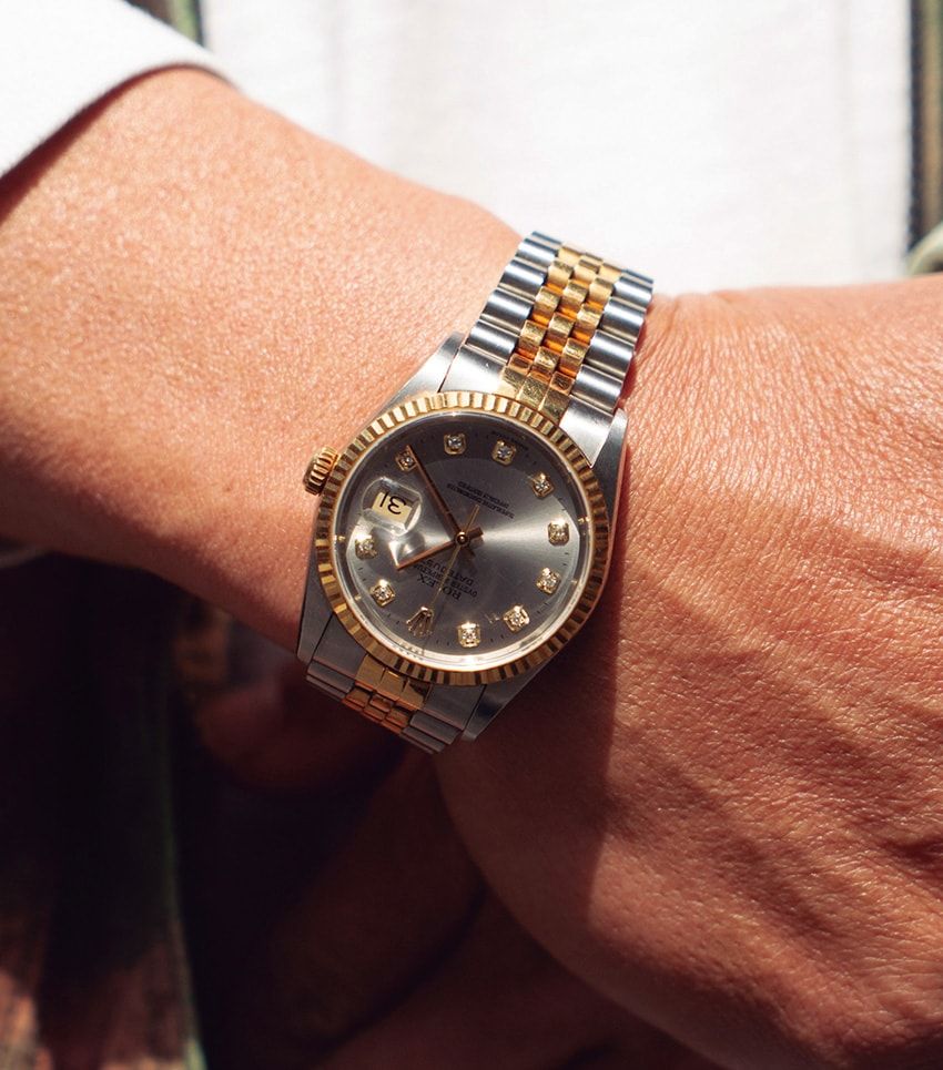 ゴールド、ダイヤが輝く「デイトジャスト」が夏の日差しを優雅に跳ね返す。