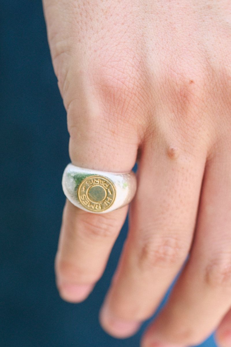 シャツ=アールサーティーン Tシャツ、デニム、バッグ=すべて古着 シューズ=コンバース 眼鏡=金子眼鏡×ユナイテッドアローズ バングル、リング=ともにエルメス