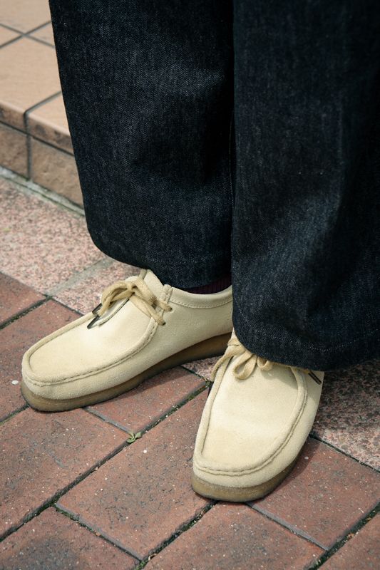 シャツはその色味を拾いつつ総柄で控えめに遊び、安定感も相性も抜群なベージュのワラビーで締める。着用アイテム数は少なくとも、脱・無難に不足なし。