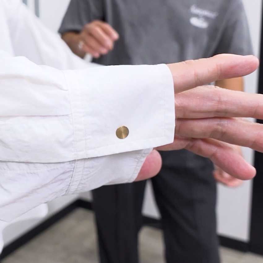 キクチ このシャツはボタンにゴールドが使われてるのがポイント。これに合わせて、細めのゴールドネックレスを付けても良いと思う。