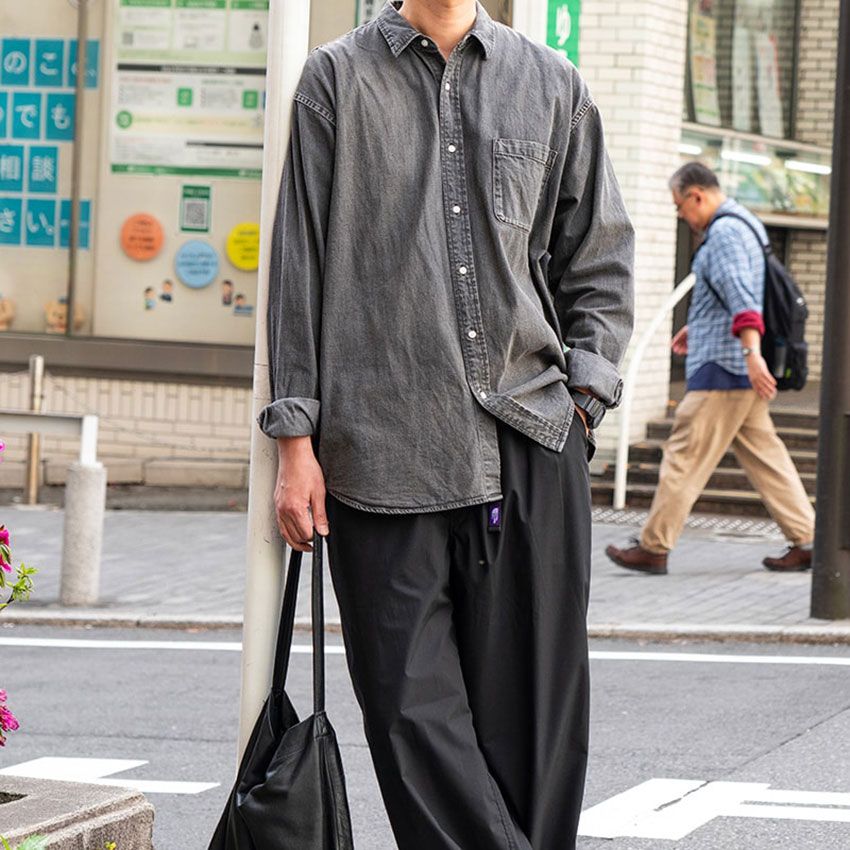 ▶︎山隈さんのスナップをすべて見る山隈 豊さん(33歳)限りなくグレーに近いデニムシャツ、イージー仕様のナイロンパンツ、ツヤ感のあるレザートート。何気ない感じにも見えるけれど、巧みにMIXさせた異素材使いが際立つ。シャツの着方がこなれていたり、素材によって黒のグラデーションを作っていたりと感度の高さが伺える。
