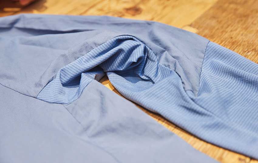 石渡 そうですね。かなりスポーティなシルエットだと思います。トレランをするとき、僕らはザックを背負うので、体にフィットする方がいいんですよ。生地に伸縮性があるのと、体に沿うように立体的な裁断になってるので、窮屈さは感じません。