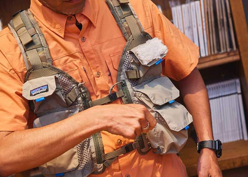 石井 そんなに何を入れるの?っていうくらい沢山ポケットが付いていますが、フライフィッシングはとにかく細かいギアが多いので重宝します。フロントパネルにはマチの大きいポケットが7つ、ツールホルダーもたくさん付いてます。フライボックス、網、はさみも簡単に手が届くようになってます。