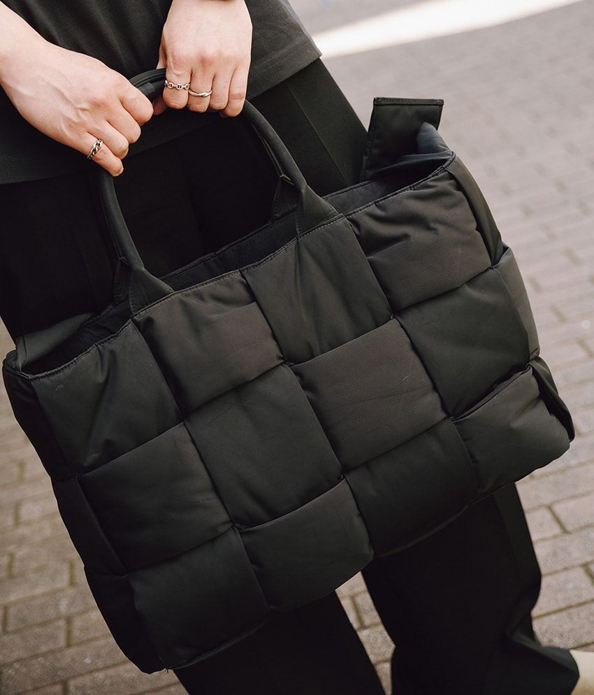 福島一平さん / 37歳スケートブランドのメッセージTと無造作に首掛けしたヘッドフォンが、全身黒を小粋に彩る。そして、アイコニックなパデッドナイロン製トートをさらり。