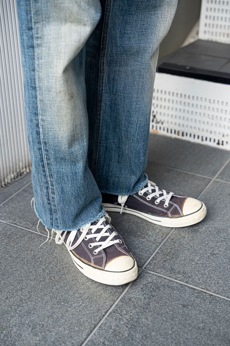 ▶︎石橋さんのスナップをすべて見る石橋朋大さん(24歳)テックな素材が注目される一方、定番アイテムにも着たくなる魅力が詰まっているストーンアイランド。石橋さんはブルーデニムをチョイス。色落ちが豊かなストレートデニムは、股上が深めでタックインすると装いに個性が生まれる。そしてカットオフされた裾が「雰囲気ある男」の決め手に。