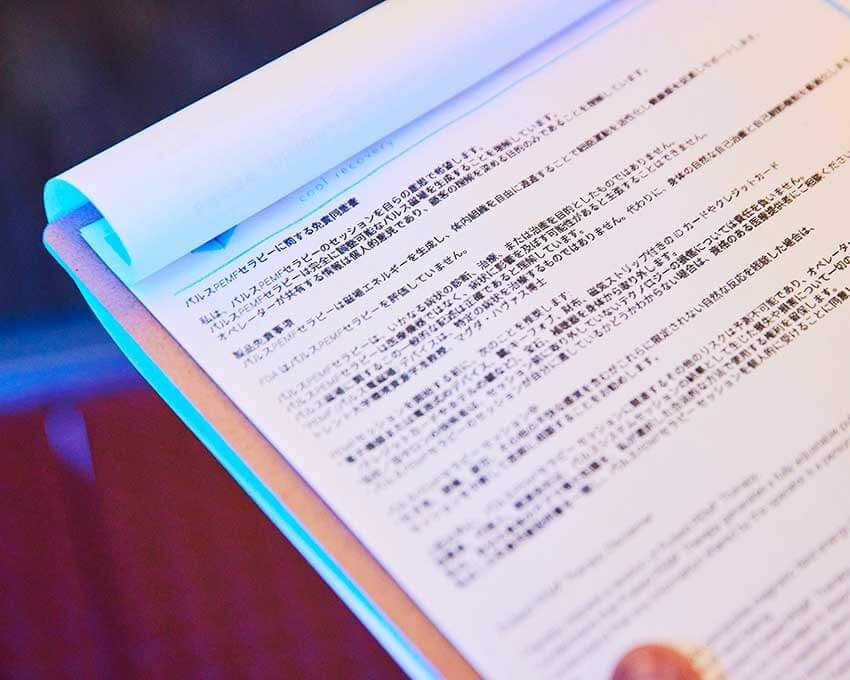クライオセラピー」と比べても、より手軽な施術。準備はシンプルで、問診票に健康状態やセッションの目的(疲労軽減、ストレス解消、肌のハリ改善など)を記入し、スタッフと軽くカウンセリングをするだけ。着替えも必要なく、上着を脱ぐ程度でOKだ。