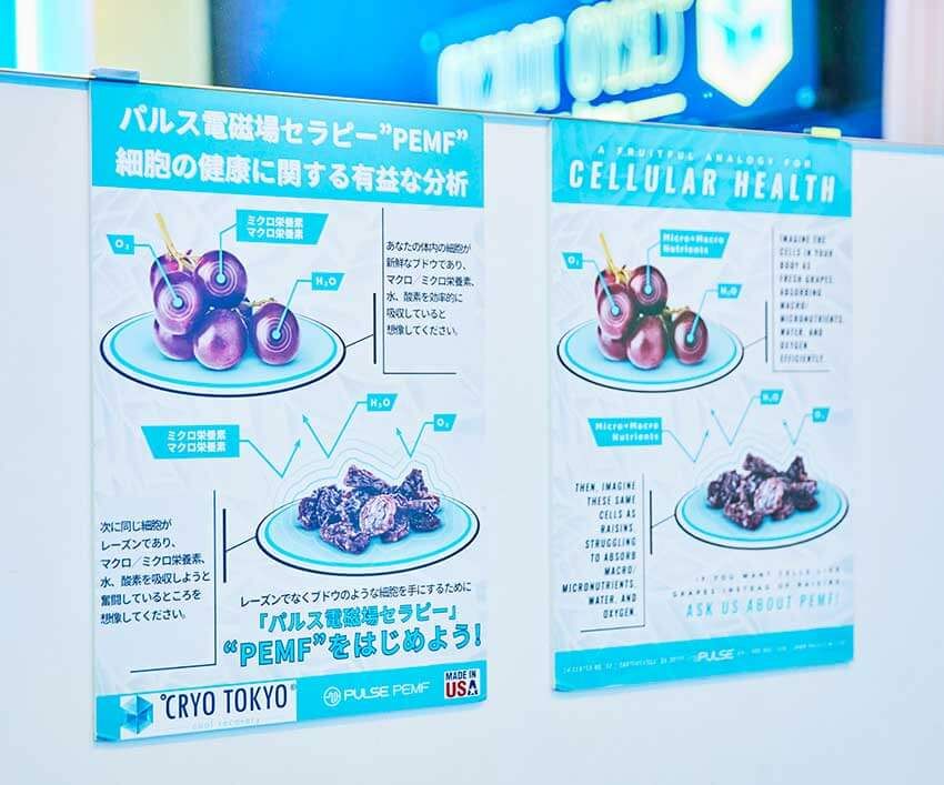 ストレスや疲労で疲弊した細胞を、乾いた「レーズン」にたとえると分かりやすいかもしれません。乾燥し水分が抜けたシワシワの状態の「レーズン」を、瑞々しい「ブドウ」に戻すように、電磁場パルスで刺激を与え、細胞自体を本来の状態に“整える”ことを目的にしたセラピーです。